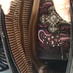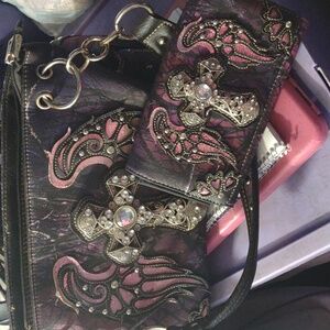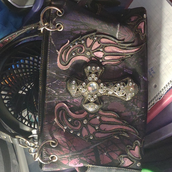 I'm selling a western themed bag with a cross and angel wings it's a pretty rose pink never used not my style