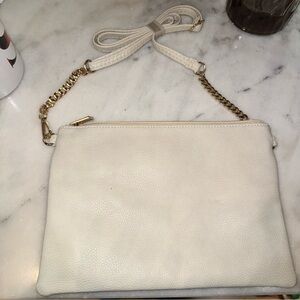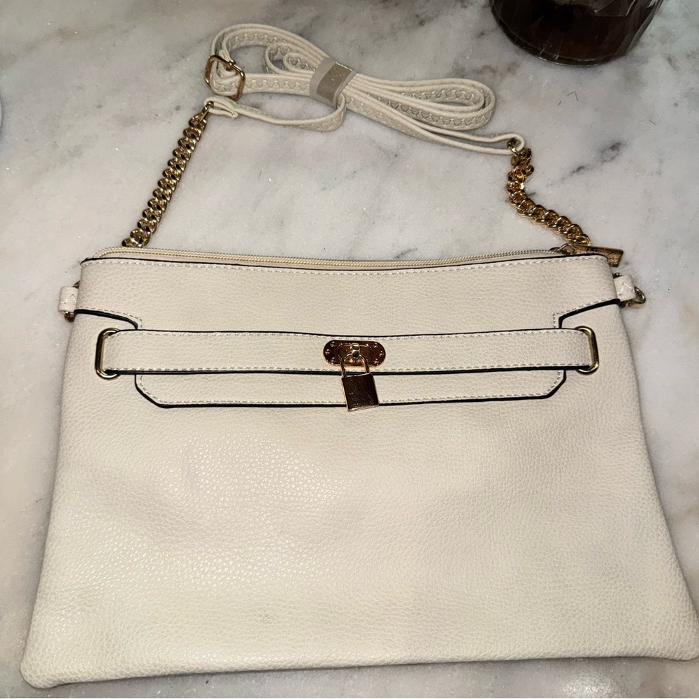 Love this bag! It’s so simple yet elegant. You can dress is up or down. It has a lock detail on the front. Zipper closure. Detachable strap that has chain details. Brand new, never used.