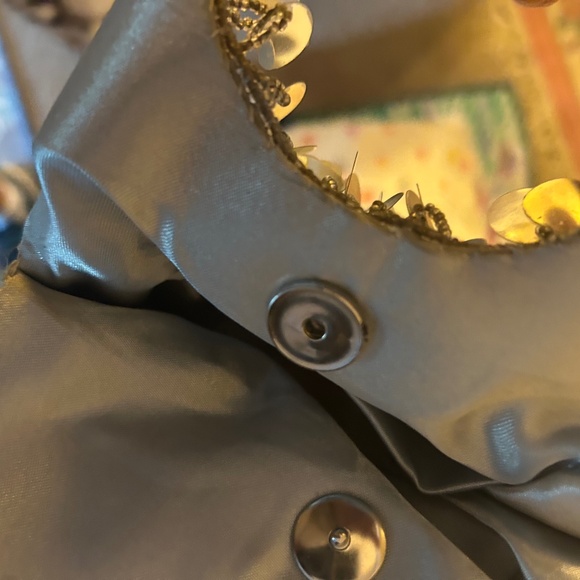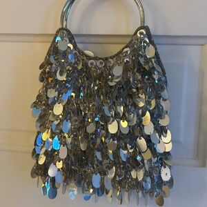 Silver evening bag. With silver sequins and bead work. Small with a silver grey interior with one pocket. Hooped handles. Size approx 8 in length and 7 in wide.