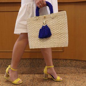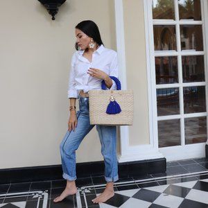 Bolso hecho a mano en palma de Iraka con borla en azul rey y asas del mismo color.