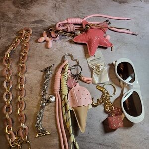 Set of 7 pieces. sunglasses, 2 bag charms, key charm, pair of earrings, purse chain charm, and either a apple watch band or a bracelet