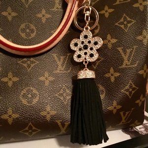 Tasseled Bling Bag Charm! Faux suede tassels, and crystals on flower shape.