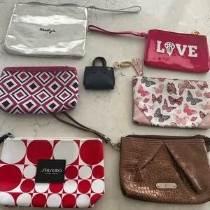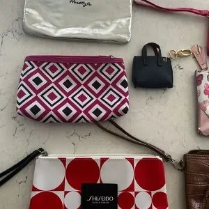 6 bags that can be used as cosmetic bags, wristlets or anything you’d like. Some used a bit more than others also included is a mini purse charm you can hang anywhere or accessorize to a purse