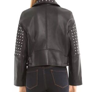 Genuine black leather jacket with silver studs. Features zippered pockets and adjustable belt.