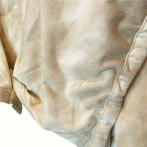 Draped collar jacket with long drawstrings, long sleeves, open front which partially closes with snaps, front welt pockets. Although new with tags, this jacket does have some small runs or picks in the material from being in store display. A photo of the longest area on collar is posted.