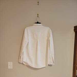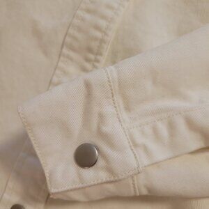 Off white denim collar shacket with 2 front pockets. Eight silver snaps in front and on the cuffs of sleeves. X stich pleating on the back. Nice shacket wear with a dress, skirt and jeans paired with Cowboy boots and sneakers. EUC