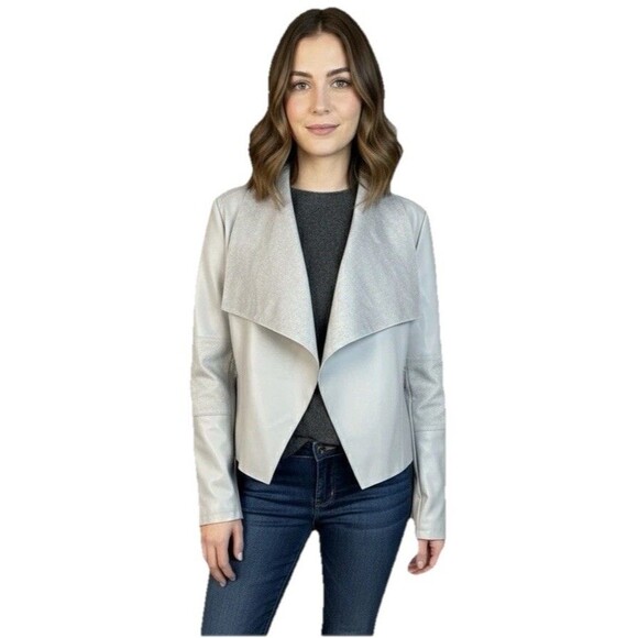 Elevate your wardrobe with this chic and modern faux leather jacket from Bagatelle. This jacket features a beautiful drape/waterfall collar and a sleek moto-inspired design, perfect for layering over a sweater, blouse, or dress.
