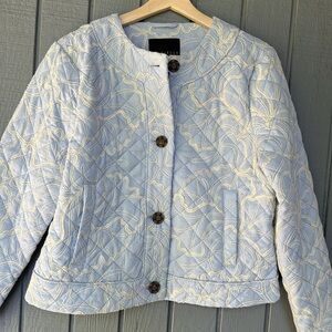 Stay stylish and warm with this elegant pale blue quilted jacket. Perfect for any occasion.NWT