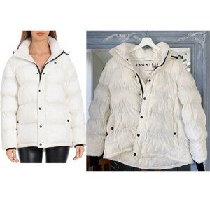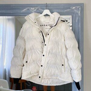 Bagatelle Ivory White Puffer Jacket with hood M Bagatelle Ivory White Puffer Jacket with hood Bagatelle Sport Women's Small Puffer Jacket Thermal Puff Removable Hood Ivory NWT Bagatelle water-resistant puffer coat Drawstring hooded neckline; snap/zip front One interior verticle zip pocket Side slip snap pockets Relaxed fit Hem hits hip Removable hood Thumb-hole cuffs Nylon Lining/fill, polyester Knit, polyester/spandex