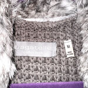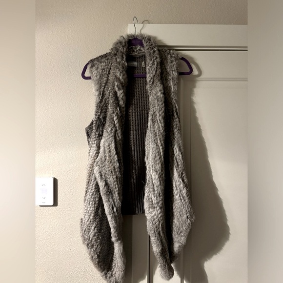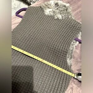Elegant gray sweater vest purchased at Nordstroms for $350, real rabbit fur, incredibly soft and luxurious. Has a beautiful drape to it and soft knit back. Back is a very neutral foresty green/grey color. The color palette is extremely complimentary to any skin tone and adds a touch of luxury to any fall outfit. Very comfortable to wear and durable. Has been worn but is in great condition and will last many years to come if cared for properly. Size medium but can for small and large just as nicely.