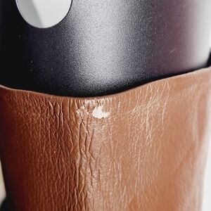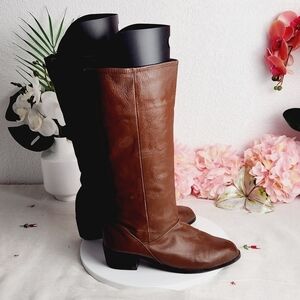 Key Words: Tall genuine leather dark brown pull-on boots, almond toe, elastic gusset at top back, thick chunky stacked rubber heels measure about 1.5”