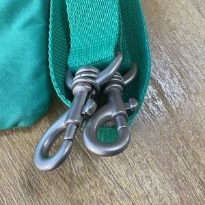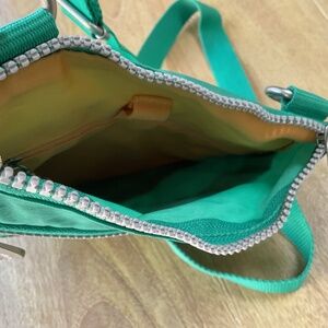 This is a “like new” Baggalini Fern-Green double zip crossbody nylon travel bag. It has a 100% nylon outer shell with a sherbet orange polyester interior lining for a pop of spring color including the front double zippered pockets. The green nylon is accented with sturdy grey zippers adding a striking exterior. The matching “fern-green” adjustable strap is also removeable with heavy duty silver hardware that is both attractive and long wearing. The bag measures 7.5”W X 9”H. This delightful bag is also washable making it a travel friendly beauty that is ready for fun and adventure! Enjoy as a gift for a friend or for yourself this spring and summer!