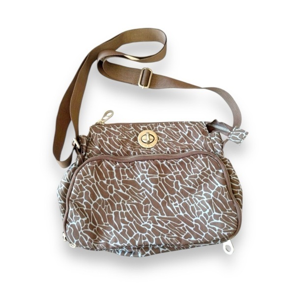 Baggalini Taupe Travel Bag Crossbody Geo Print Pockets Organizing Turnlock RFID