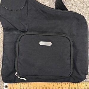 This is from my collection of Baggalini bags, and this one was never used. On the front is a zipper section that has two separate slots inside, with a pen holder. There is another front section with a velcro closure. inside has multiple card slots, and a deep zipper section. The outside zipper goes all the way down, to allow you to open it really wide to access your things. The back of the bag has a large open section that is good for sunglasses and phones.
