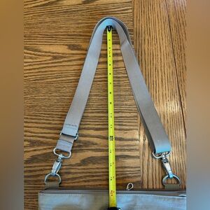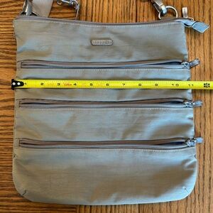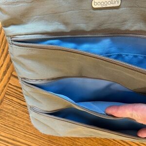 Elegant Baggallini crossbody bag in a tan/taupe color with 3 front zippered pockets and a back magnetic closure pocket. inside features a very clean light blue lining and has slots for credit cards and another small zipper pocket.