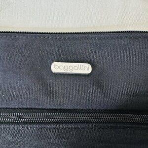 Baggallini Big Zip Crossbody Purse with Lots of Pockets and zippers inside and outside! Nylon body with polyester lining. Wide Strap is detachable. Approximately 11 x 11 inches. Outside is Black and inside lining is a light olive green. Back pocket has magnetic closure.