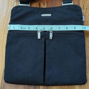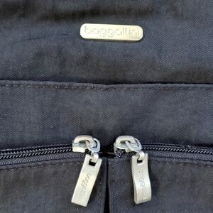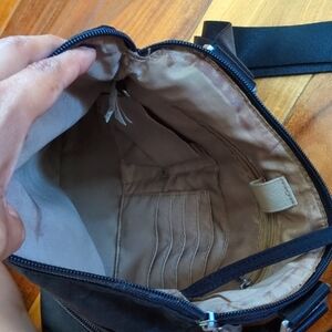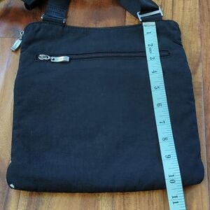 Style: Black crossbody bag with multiple compartments: 3 exterior pockets with zipper closure (2 in front and 1 in back), 1 exterior pocket with a magnetic button closure, 1 large interior with a zipper closure that includes credit card holders and additional open pockets.