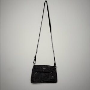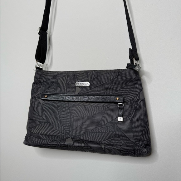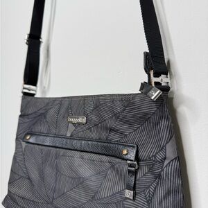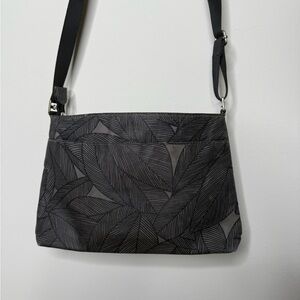 Chic crossbody bag with a unique geometric design. Includes a convenient front zipper pocket.