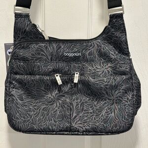 The Baggallini Cross Over Crossbody Bag in Midnight Blossom is a stylish and practical accessory for travel and casual occasions. This square-shaped bag features a zip and snap closure, adjustable black crossbody strap, and silver hardware accents. Made of durable nylon with a floral pattern, it includes multiple pockets and compartments for organization. Perfect for those who love sports and want a fashionable yet functional handbag, this bag is a versatile choice for everyday use in the fall season.