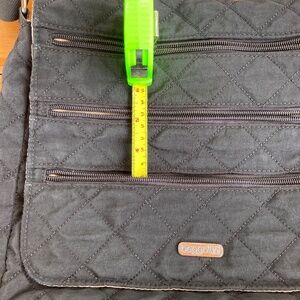 This a preowned crossbody by Baggallini with a quilted design in black with tan interior. The strap is about 53-54 inches fully extend. The outside has normal wear and is in good condition but there is some wear that is noticeable on some of the hardware. The tan inside has wear that consists of stains from pens etc. This is a great bag for everyday or travel. Inside pockets include a zip pocket, pen slots, small open pockets and a padded larger pocket with a velcro closure for a tablet/iPad. The back of the outside has a magnetic closure large pocket that can be used as a pocket or you can unzip the bottom and place it over the handle of a rolling suitcase. The front flap is closed by two magnetic closures. There are 3 zippered pockets on the front that are different depths. Please see photos to see how deep each of those pockets are. There is a thin strap clipped inside the bag and can be taken off. Measurements are approximate