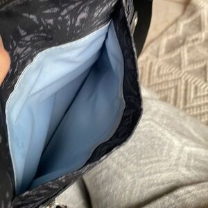 Its sleek black nylon exterior is accented with a subtle floral print and faux-leather trim, while the light blue lining makes it easy to find your essentials inside.