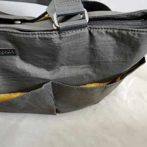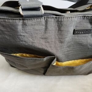 Baggallini Gray Yellow Large Shoulder Tote Organizer Bag. A modern tote with multiple uses such as a diaper bag, crafts, school, etc.! Easy to clean, lightweight, 11" shoulder strap drop, silver toned hardware, top zip closure, 1 large exterior snap pocket with 3 slip pockets, logos on zipper pull & exterior tag, 1 interior zip pocket. 100% nylon exterior & 100% polyester lining. Approximately 17.5" x 11" 4.5". No rips or stains. Like new condition!