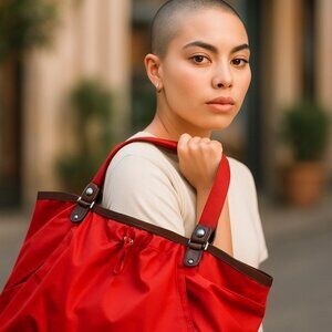 This durable red/orange tote bag, featuring brown trim and versatile compartments, is a practical accessory for daily use or travel.