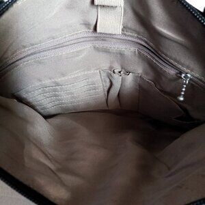 Main compartment has zipper closure -- organizer panel on interior rear wall includes 2 elastic lipstick/pen holders, 6 card slots, 2 pen slots, slip pocket and zipper pocket