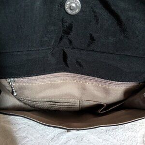 Exterior front wall has gusseted pocket with flap and snap closure -- organizer pocket on interior rear wall includes 6 card slots, slip pocket and zipper pocket