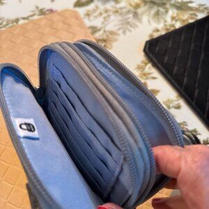 This small, lightweight bag features a solid gray exterior with a zip closure and silver hardware accents.