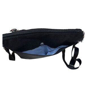 This black crossbody bag is made of lightweight, water-resistant nylon and features multiple pockets and interior organization.