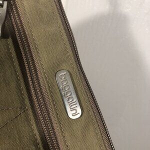 Baggallini beige sand wristlet, one main zipped compartment, front zipped compartment and one with a snap button, back snap button, measures approximately when laying flat 8.5"x5.5", can contain passport and boarding passes.