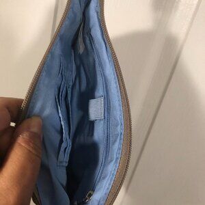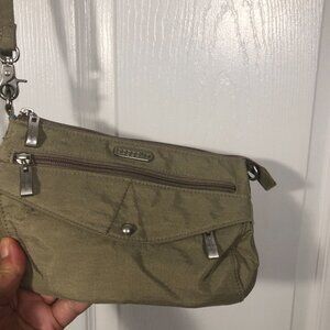 Baggallini beige sand wristlet, one main zipped compartment