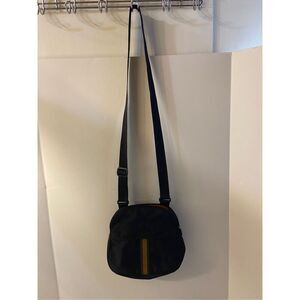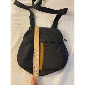 Baggallini black oval crossbody Orange South Western Stripe Nylon purse. measures 9"x10".