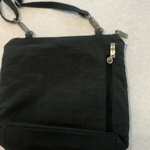 Baggallini crossbody bag. Gray with pink interior. 9-1/4” wide x 9” tall. Two zippered pockets on front and one large zippered compartment on back. Main zippered compartment has one side zippered pocket with six slots for credit cards or ID. Adjustable Strap drop is 16” to 29”.