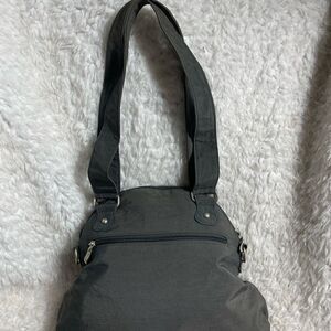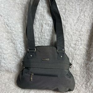 Baggallini gray Nylon small shoulder bag with padded interior compartment .two front zipper pockets,back zipper.top zipper the inside lining has a side zipper nine organized pockets a padded side compartment for a MAC book.pre owned in good used condition missing the crossbody strap small stains on the inner top lining see all pictures any questions please message.B11