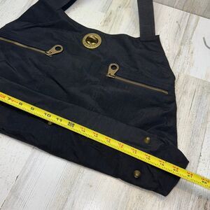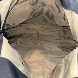 Baggallini large multi functional tote bed is perfect for travel. Two outer pockets and rotating locking closure in front. One large zipper pocket on the outside back. multi-purpose pockets on both sides of inner lining. Bag is approximately 13 inches tall with 8 inch handles, 20 inch width at widest 5.5 inch base