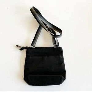 Baggallini black nylon crossbody with multiple organizational features. Tri-color strap in shades of gray. Baggallini makes great bags! Preowned.