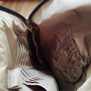 Has zippered flap front pocket with snap and 2 small side pockets. Top closes with zipper and magnetic flap. Inside is lined and has cc slots and pocket. Comes with attached “wallet” ID, etc. and a hook for keys. Measurements are 15” from top of handle to bottom of bag and 10” wide at its widest point.