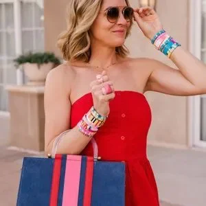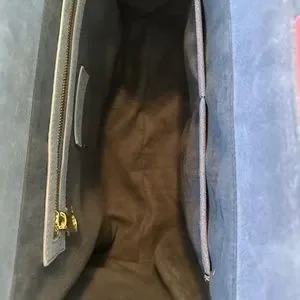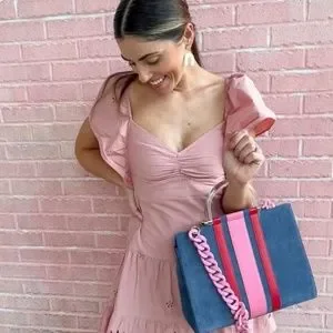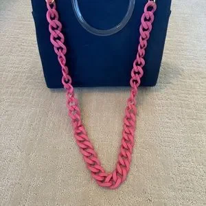 Bagging Rights Bag with navy blue suede and pink and red leather stripes. Acrylic Handles and pink crossbody strap (removable). Brand new, never used.