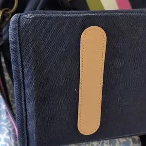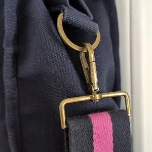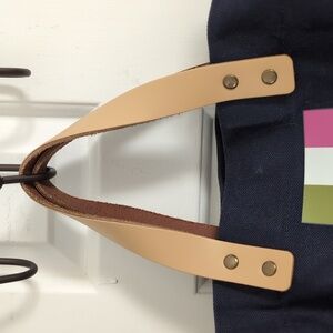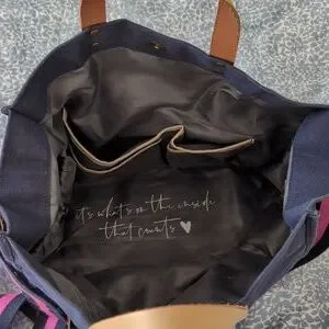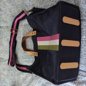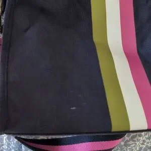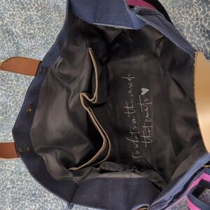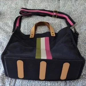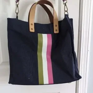 Gently used Navy blue tote bag with magenta and olive green stripe. Dimensions: 15" W across the bottom, 13" H, 6.5" deep. A few signs of wear on bottom corner shown in pictures. Bag has interior pockets and a water bottle holder.