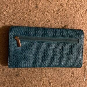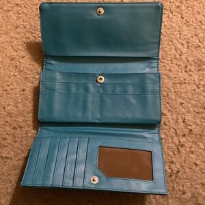 Baggit Wallet. Excellent condition. Beautiful Teal color. Tri fold. Zipper pocket on top. Zipper pocket on back. Several pockets and credit card slots inside.