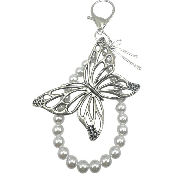 Bag/purse Charm, Butterfly with white faux pearls and bow, silver tone Brand New