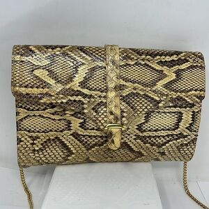 This is a gorgeous Bags by Supreme Snakeskin Python Handbag Clutch. 8.75” x 5.5” x 2” with a hidden 17” chain. Snap closure. Cream leather interior with wall zipper pocket. All the scales are in place. No odors. No tears. No stains.