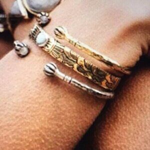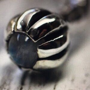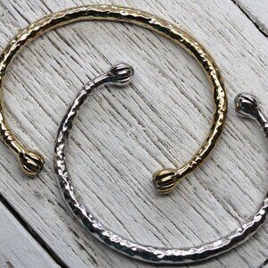 Bahgsu Jewels of Santa Barbara California Villager Cuff ~ stamped 925 Sterling Silver in hammered design ~ weight 181.44 g (6.4 oz) / with floral moonstone ends. Solid and strong. Beautiful on its own or with other bracelets. Easy on and off, comfortable to wear. Excellent condition.