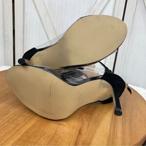 Onyx black faux suede with clear plastic sides, Peep toe, Decorative front zipper with pompom detail, Exposed back zipper, Stiletto heel