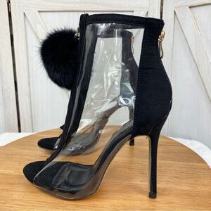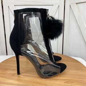 Bai Beiai Clear Peep Toe Heeled Ankle Boots PomPom Zipper Front Black 6