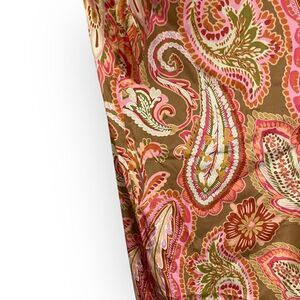 From Baiia: Designed for those who seek seamless transitions from beachside leisure to trendy bar hangouts, the Isla Wrapskirt in Barcelona is your go-to solution. Thoughtfully made in a silky and lightweight recycled fabric, this versatile wrapskirt showcases a delicate pink paisley print adorned with opulent gold tones and earthy greens. Style yours as a skirt, dress or top.