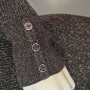 Elegant black Bailey 44 long sleeve pullover stretchy bodycon midi dress has silver metallic threading throughout and a sophisticated silhouette in Size Medium.