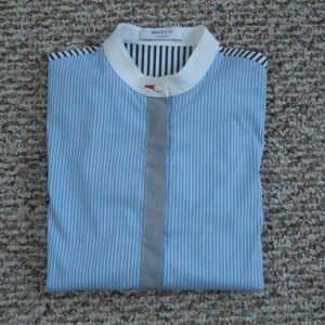 Stylish blue striped button down. Features front tie detail. Perfect for casual wear.